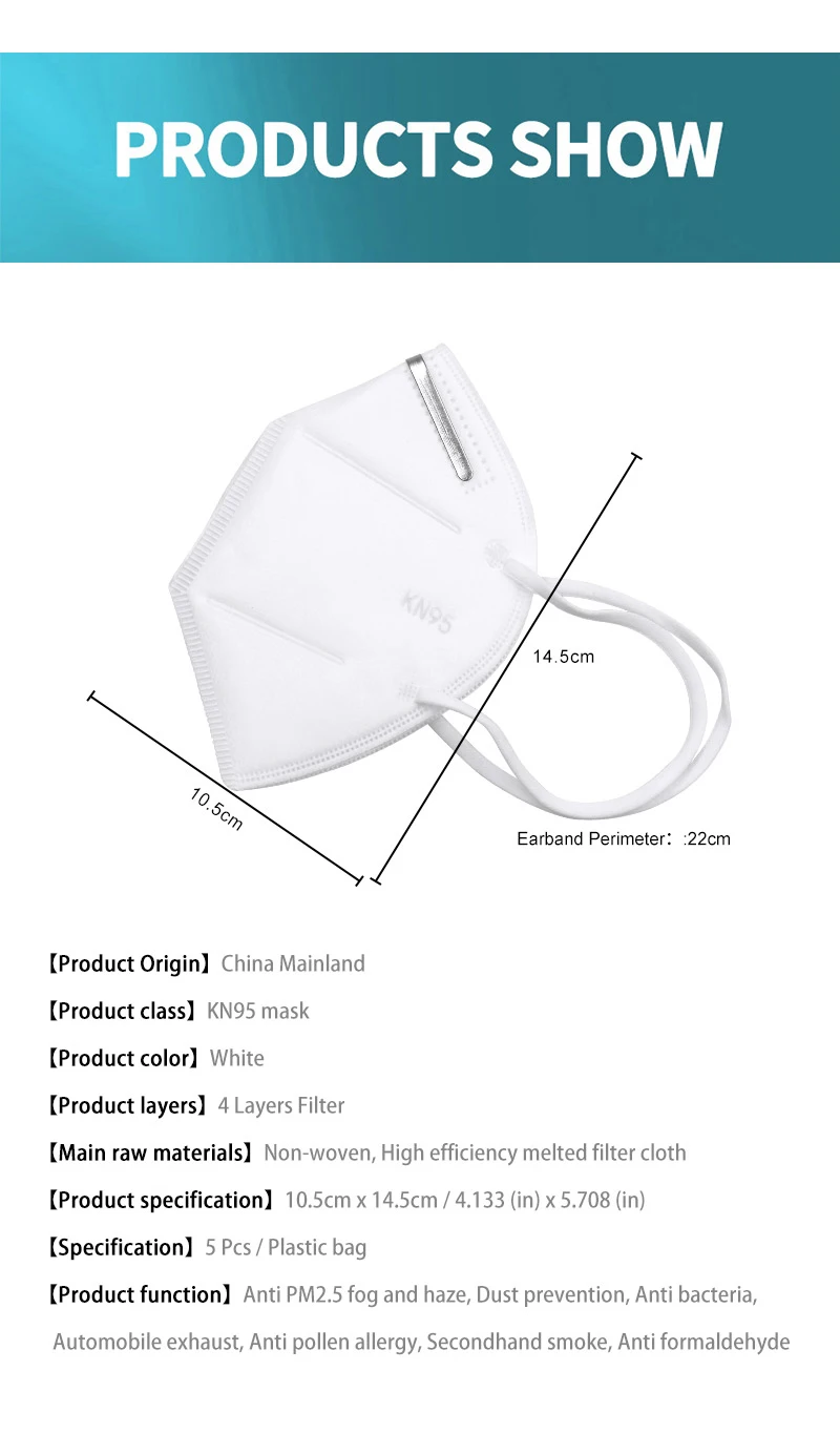 Spécifications: Nom: KN95 Masque Couleur: Blanc Taux de filtrage: ≥ 95% Matériau: couche intérieure, couche extérieure: non-tissé en polypropylène Couche filtrante: tissu soufflé électrostatique Méthode de port: courroie d'oreille Spécifications: taille unique (taille adulte générale) Champ d'application: convient à la protection contre les particules nocives telles que la poussière, les particules de brume PM2.5, les gouttelettes. Remarque: la protection fournie par ce produit peut être affaiblie pour une utilisation à long terme et dans des conditions extensibles ou humides. Taille adulte: 10.5x14.5cm Emballage Inclus: 1x5 pièces KN95 masque adulte avec sac en PVC Caractéristiques: Sûr, respirant et hypoallergénique; Et haute filtration, capacité. Boucles d'oreille élastiques sans pression sur les oreilles. Fournir une certaine protection contre la poussière, ou certaines choses toxiques. Propre et utile, il est idéal pour le travail du bois, le nettoyage de la maison et l'entretien général. Fabriqués en matériau non tissé, ils présentent une bonne tolérance de la peau et sont confortables à porter.