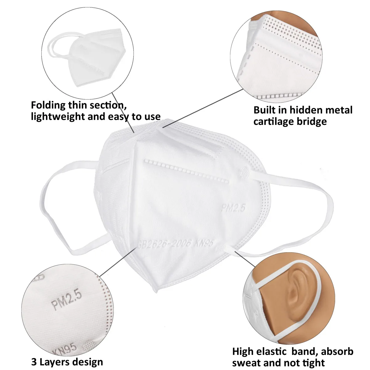 * KN95 masques, respirant, anti-poussière, sanitaire et pratique à utiliser.* Fait de matériau respectueux de l'environnement, étanche à l'humidité, non toxique, non irritant, doux et confortable.* Haute bande élastique, absorber la sueur et pas serré.* La couche interne de charbon actif peut filtrer les gaz nocifs ou les odeurs. 95% de filtration, un espace respiratoire tridimensionnel à 360 degrés, fournit une protection antibactérienne et anti-poussière pour vous.* Construit dans le pont de cartilage en métal hidtens, peut être ajusté pour éviter les vides et réduire l'inhalation de substances nocives.* Design parfait, lorsque vous le portez, il s'intègre parfaitement à votre visage. La boucle d'oreille élastique est facile à porter et aucune pression aux oreilles.* Anti-pollution, protection sûre contre les allergies, les contaminants, les bactéries, la poussière, etc. Parfait pour le médical, le salon de manucure ou tout autre domaine où une protection pourrait être requise, tel que l'hôpital, l'avion, etc.* Section mince pliante, légère et facile à utiliser.Notes: