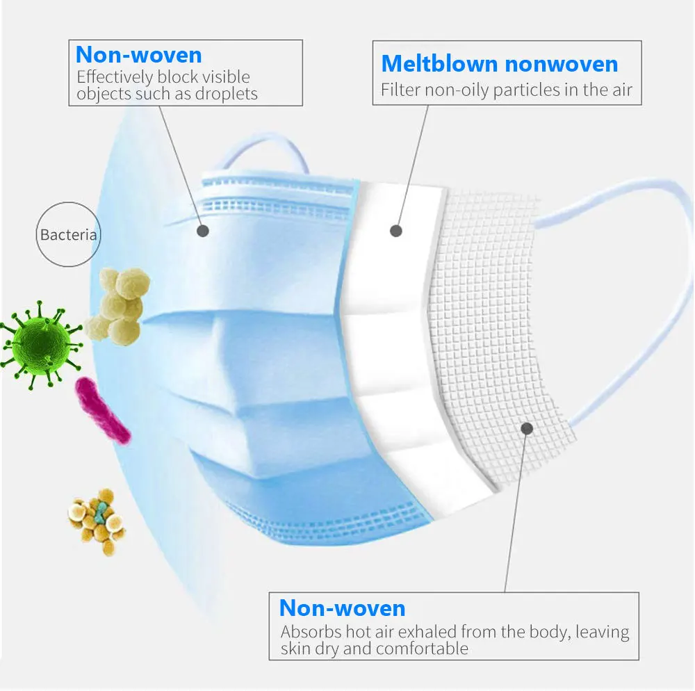 Veuillez noter que le produit énuméré est produit et distribué à l'étranger et soumis aux lois de son pays d'origine.3PLY - Introduction:Matériel: non-tissé/tissu soufflé par fonte/tissu non-tissé amical de peauType: masque anti-poussière à 3 couchesStyle de masque: oreille accrochanteCouleur: Bleu ClairEmballage: 10/20/30/40/50/100/200 piècesEffet de filtre: niveau de protection1. Fait de matériau respectueux de l'environnement respirant, étanche à l'humidité, non toxique, non irritant, doux et confortable.2. La conception non tissée spéciale de 3 plis, fournit des protections contre la poussière, l'échappement d'automobile, le pollen, etc.3. design parfait, lorsque vous le portez, il s'intègre parfaitement à votre visage. La boucle d'oreille élastique est facile à porter et aucune pression aux oreilles.5. texture douce et usure confortable. Peut filtrer les particules toxiques et est étanche