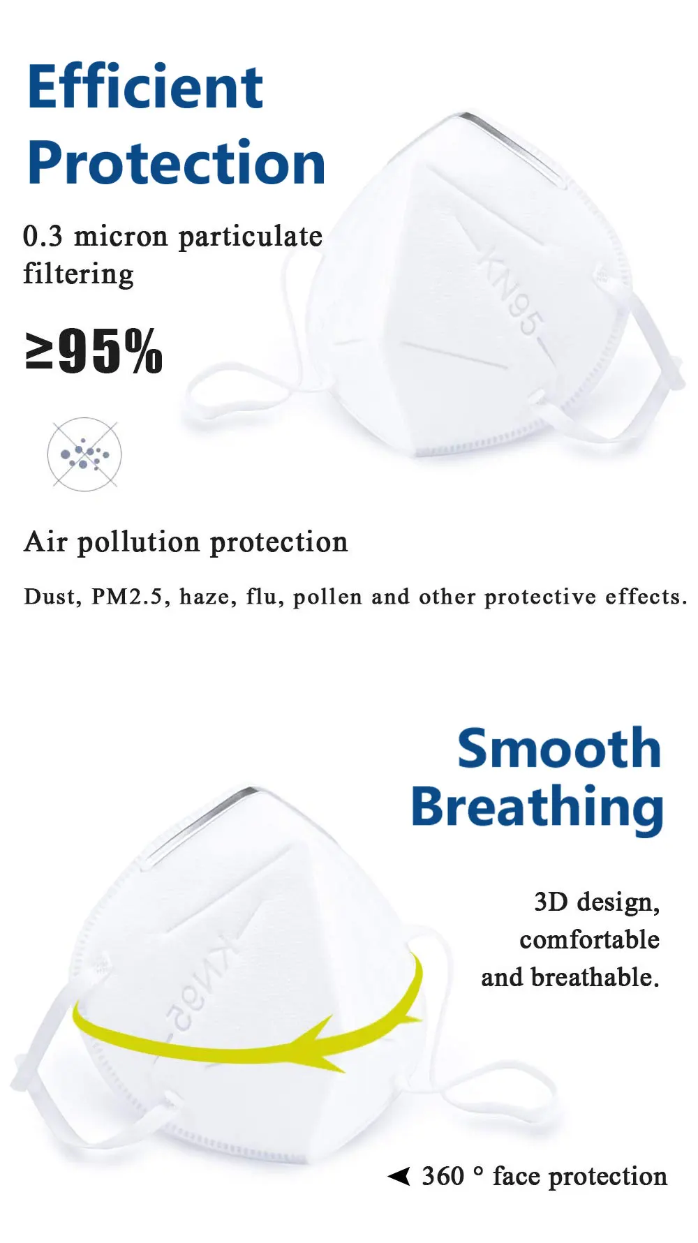 Veuillez noter que le produit énuméré est produit et distribué à l'étranger et soumis aux lois de son pays d'origine.KN95 - Introduction:Couleur: BlancClasse de Protection: KN95Taux de filtrage: ≥ 95%Emballage: 1/5/10/20/30/40 piècesFonction:Vous garder à l'abri du brouillard, du Smog, de la poussière, de la Pollution de l'air, des allergènes et de l'humidité, vous gardant ainsi en bonne santé.Description:Filtration PM 2.5 avec un taux d'efficacité jusqu'à 95%.Les médias filtrants de haute qualité avec des microfibres à charge statique avancées aident à rendre l'expiration plus facile et à inhumer, améliorant ainsi le confort de tout le monde.Une conception de sangle à deux têtes avec une fixation à deux points aide à fournir un ajustement sûr.La construction légère améliore le confort pendant l'utilisationNote:1) afin de fournir une meilleure protection, le matériau de chaque lot de marchandises sera plus proche. S'il y a une différence dans les marchandises réelles, c'est normal. Ne vous inquiétez pas, si vous avez des questions, veuillez d'abord nous consulter.2) nous promettons que vous choisissez des masques KN95. 100% des masques que nous envoyons sont des masques KN95. Le lot d'achat est différent, et les fabricants des masques peuvent être différents. C'est normal. Après tout, il existe plus d'une usine produisant KN95. Veuillez comprendre avant de passer une commande. Merci!